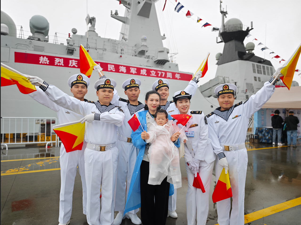 “爸爸你看,这是南通舰的官兵用旗语跟您说‘生日快乐’!”旗语演示区,陈怡和没能来到现场的父亲视频通话,引来不少人围观。